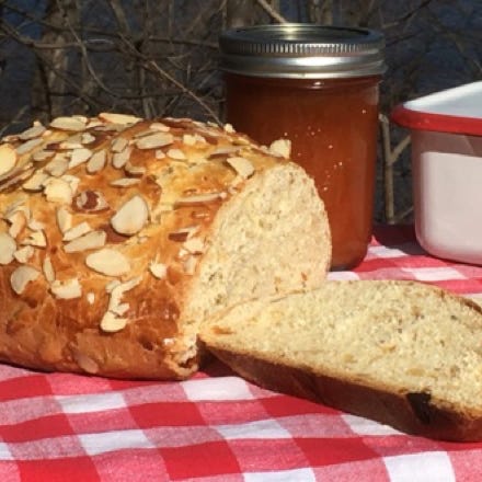 Made with flour, milk, butter, sugar, raisins, almonds, eggs, lemon, rum, vanilla, yeast, salt
