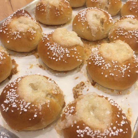 Made with flour, butter, milk, sugar, egg, cardamom, yeast, salt
